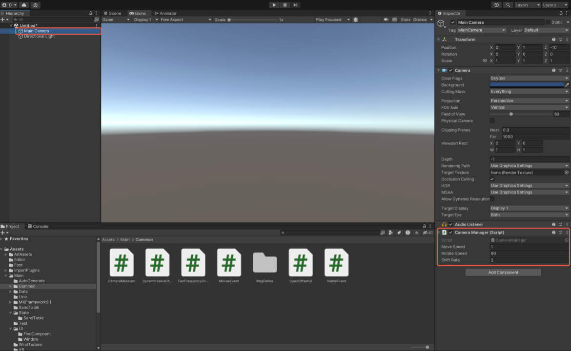 2. 新建一个新的场景,并在 Main Camera 对象上挂载 “CameraManager” 脚本。