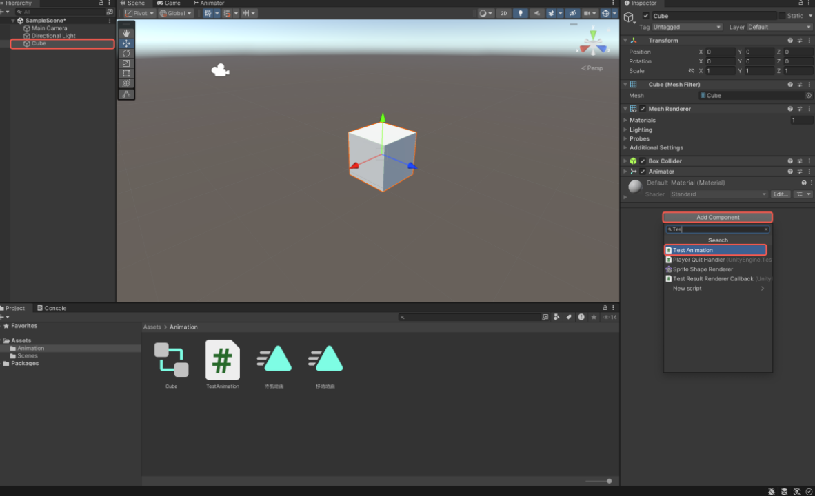 3. 将 TestAnimation 脚本,挂载我们创建的动画对象上。