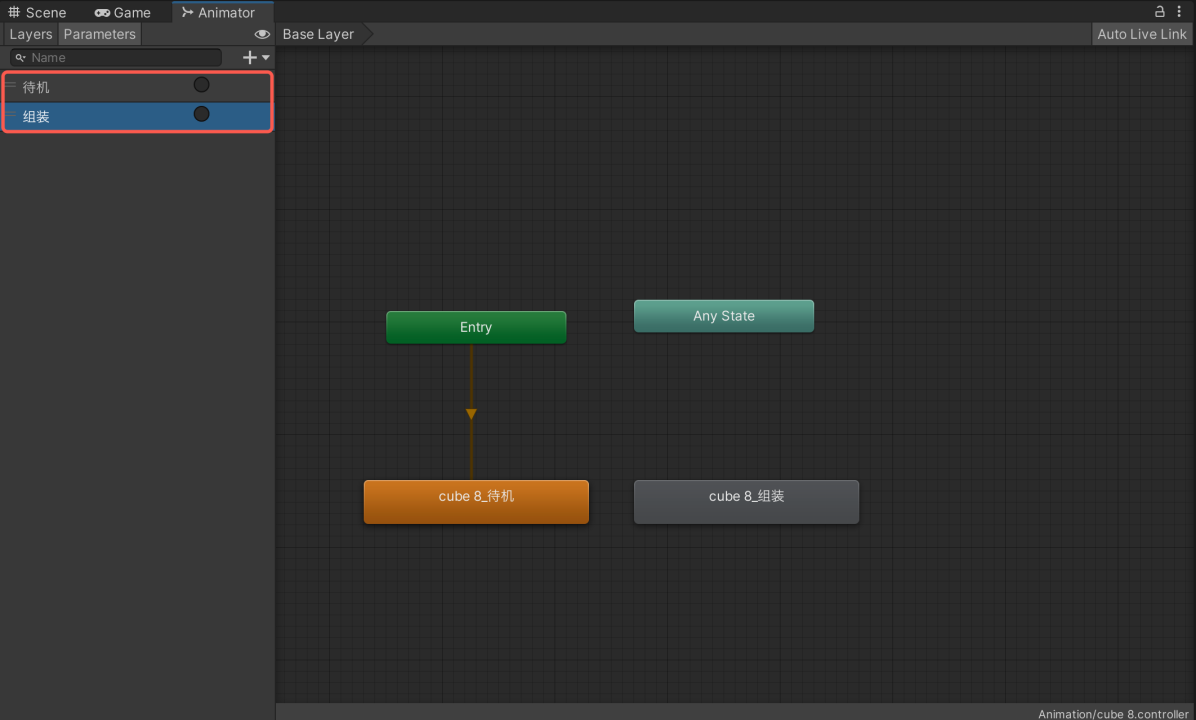 6. 在动画状态机中新建2个属性,命名为“待机”和“组装”。
