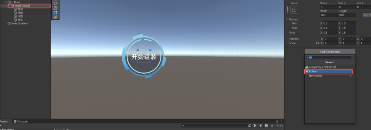 2. 给 “开始组装按钮” 添加 Button 组件。