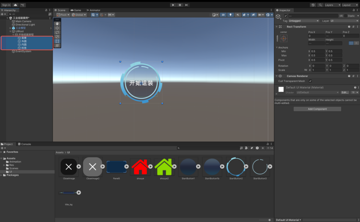 9. 将 “背景”、“外圆”、“内圆”、“标签” 4个对象,设置为“开始组装按钮”的子对象。