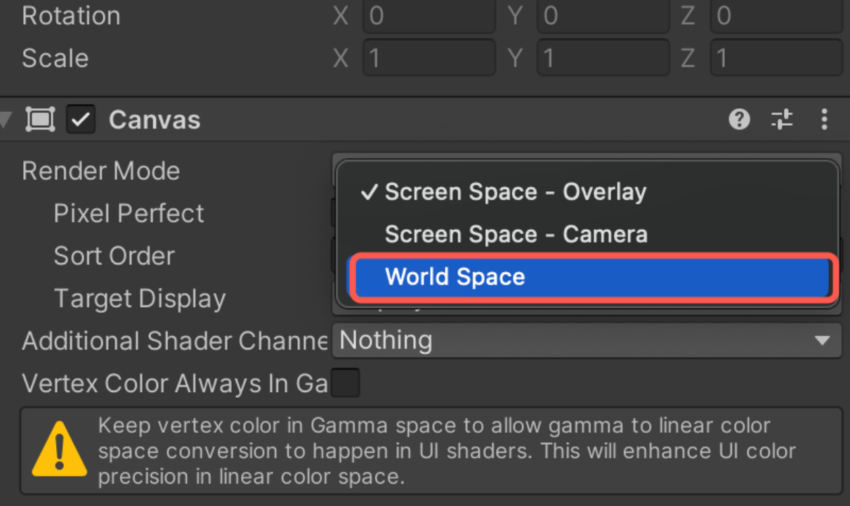 2. 将 Canvas 的 Render Mode 调整为“World Space”。