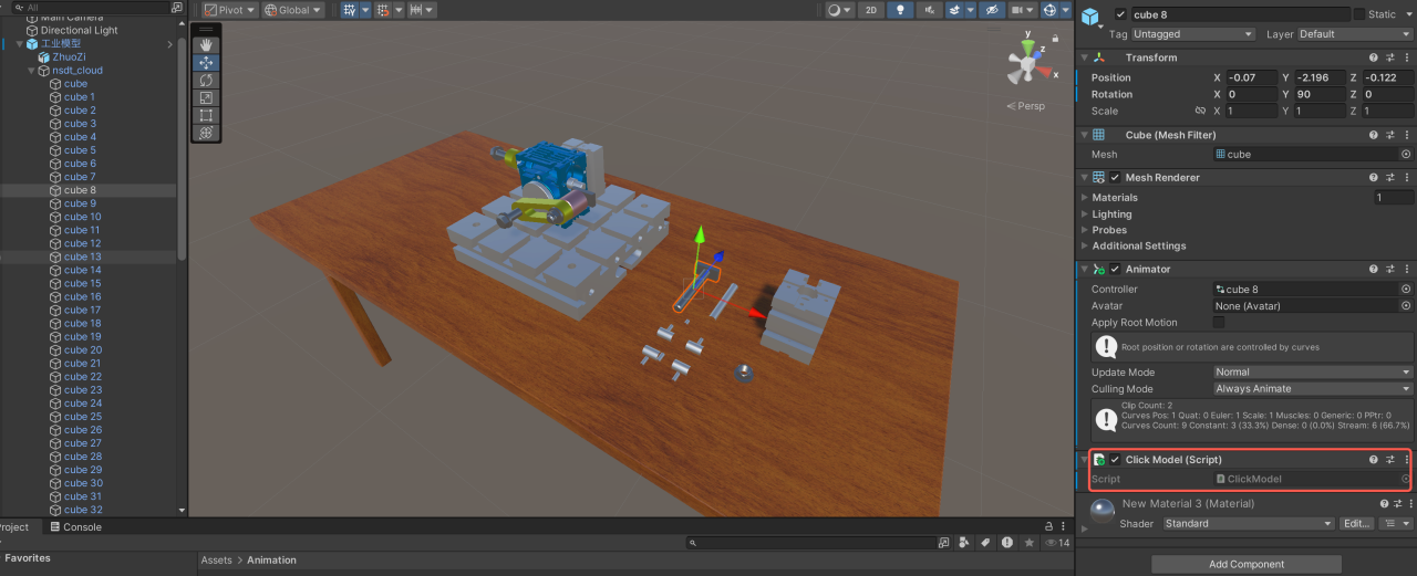 9. 将“ClickModel”脚本,挂载到“cube 8”对象上。