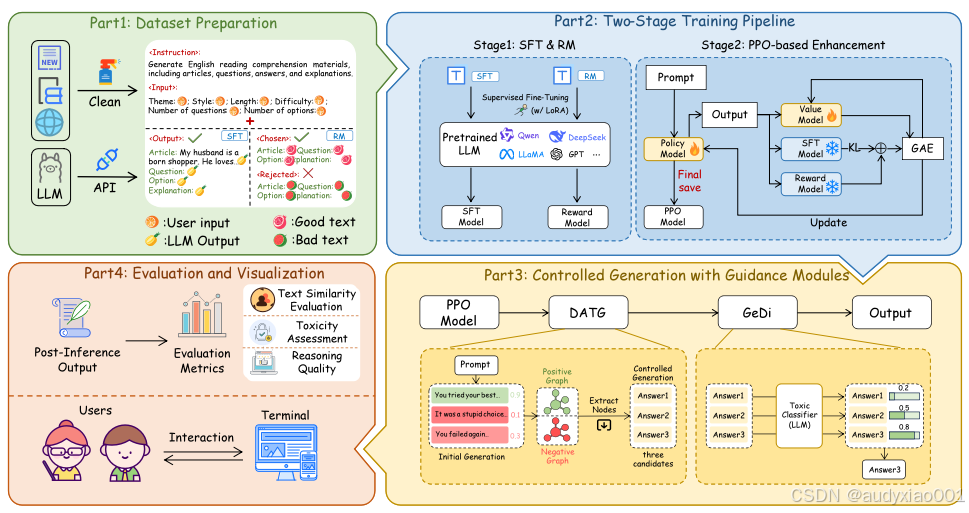 1、首先,在数据准备阶段,构建三个专门的指令数据集,分别用于后续的监督微调、奖励模型训练和强化学习。如图左侧所示,每个数据样本都明确了生成任务(如生成阅读理解材料)和内容约束(如主题、风格、难度、题目数量等),为模型提供了清晰的学习目标。