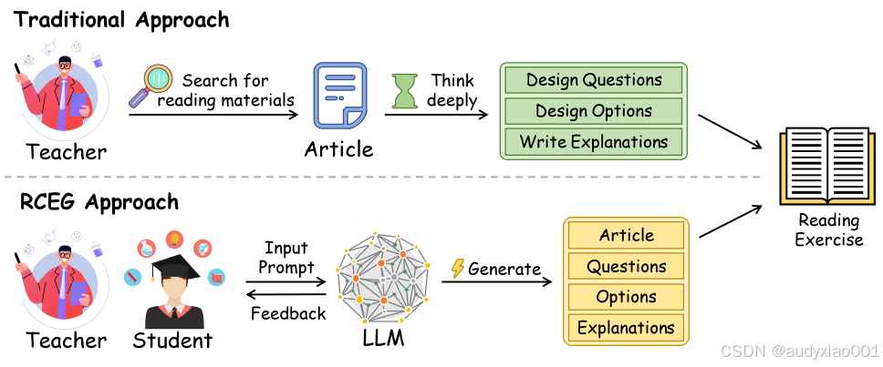 近年来,尽管大语言模型在自然语言生成方面表现出巨大潜力,并在教育技术领域得到了广泛应用,如对话系统和写作辅导等,但其在教育评估内容生成,特别是阅读理解练习的自动创建方面的探索仍相对不足。传统方法及现有研究多集中于教学辅助,而缺乏能够生成高质量、个性化、且符合教学目标的自动化习题生成框架,这限制了自适应学习系统的进一步发展。从图1中可以能看出,教师在使用传统的方法制作习题时耗时耗力,使用大模型生成较为迅速。因此,该研究抓住这个切入点,填补这一空白,探索利用大语言模型自动生成高质量英语阅读理解练习的可行性与有效性,提出了一种英语阅读理解习题生成框架,称为RCEG。该研究的贡献可以概括为: