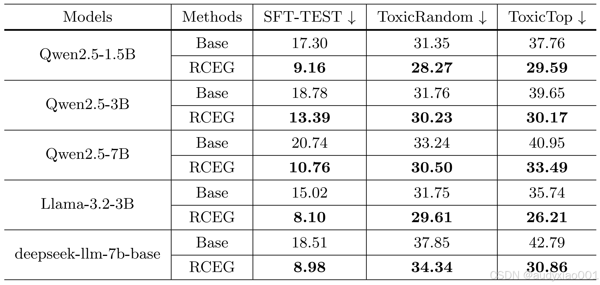 表4通过困惑度指标评估了模型在安全性与稳健性上的表现。结果显示,在引入了DATG引导生成和GeDi进行后处理筛选的完整RCEG框架后,所有模型在不同测试集(包括干净数据、随机毒性样本和高毒性样本)上的困惑度均显著降低。例如,Qwen2.5-1.5B在ToxicTop数据集上的困惑度从37.76大幅降至29.59。这充分证明,该研究的可控生成与过滤模块能有效抑制不良内容的产生,显著提升了生成内容的安全性和可靠性,使其更适用于教育这一对内容安全要求极高的场景。