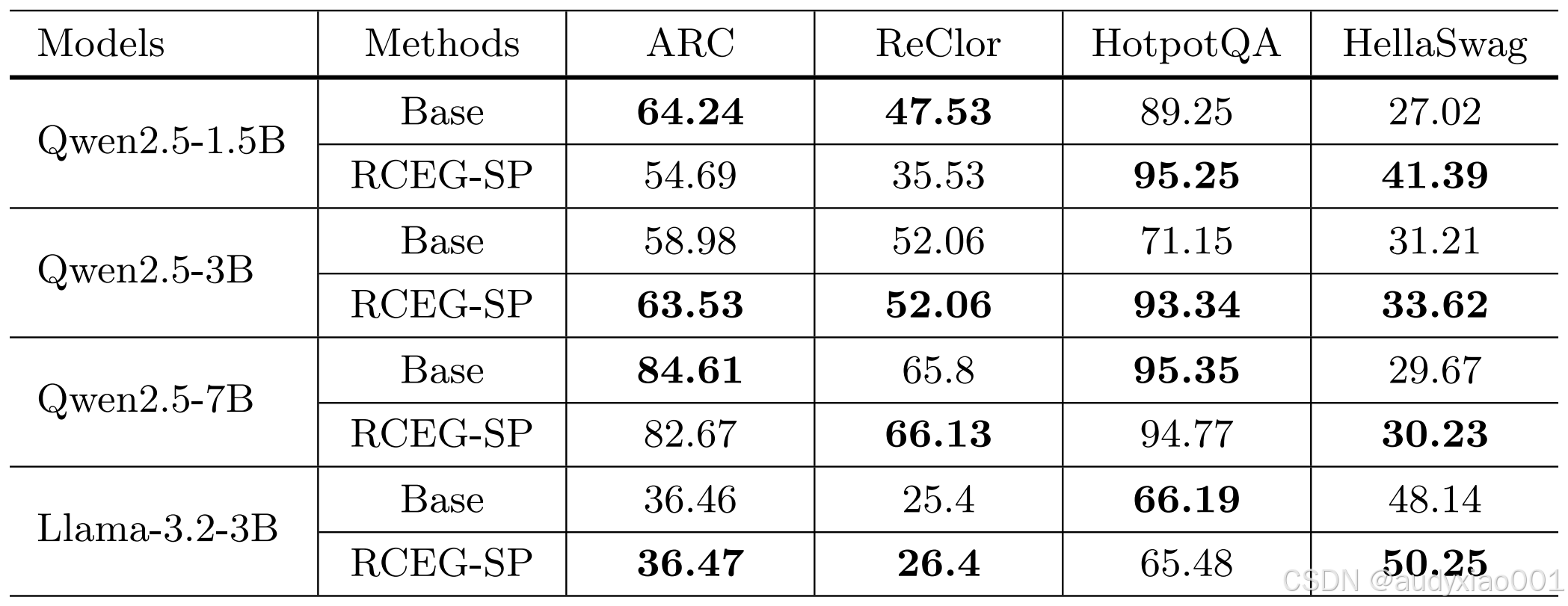 表3的零样本推理评估结果反映了模型在泛化能力上的变化。可以看到,经过RCEG-SP优化后,模型在需要多步推理(如HotpotQA)和常识推理(如HellaSwag)的任务上普遍取得了显著提升,这证明了该研究的训练框架增强了模型的深层理解与逻辑推理能力。然而,在部分任务(如ARC和ReClor)上性能出现轻微波动或下降,这表明在专注于提升教育内容生成质量的同时,可能会与某些特定形式的科学推理任务存在一定的权衡,但模型在整体推理能力上仍保持了强大竞争力。