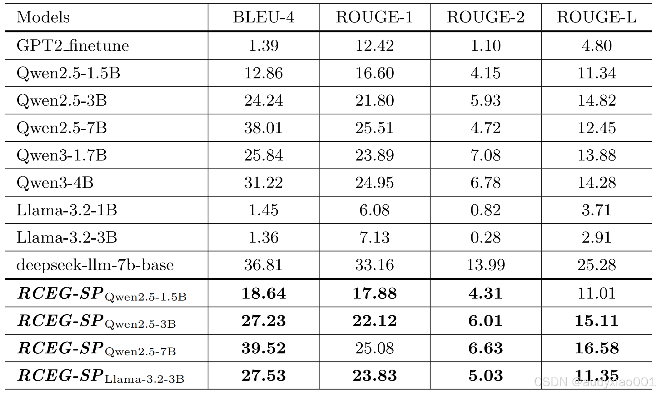 如表2所示,经过监督微调SFT和近端策略优化PPO两阶段训练的RCEG-SP模型,在BLEU-4和ROUGE系列指标上均显著超越其对应的基础模型以及先前的GPT2微调基线。这表明该研究的两阶段训练pipeline有效提升了模型生成内容与人类参考文本之间的词汇和语义对齐度。例如,Qwen2.5-3B模型在优化后,BLEU-4得分从24.24提升至27.23,这证实了该训练方法能够使模型产出更准确、更贴合预期的阅读理解练习内容。