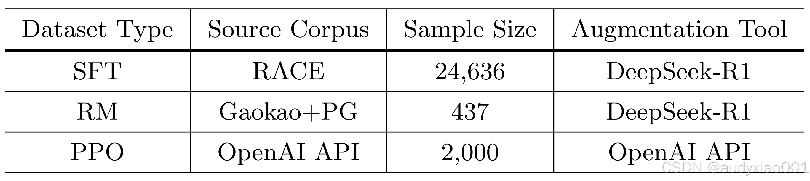 1、构建了三个针对特定任务的数据集,以支持教育内容生成的完整指令对齐训练流程。这些数据集分别用于监督微调(Supervised Fine-Tuning,SFT)、奖励模型训练和基于近端策略优化(Proximal Policy Optimization,PPO)的强化学习。