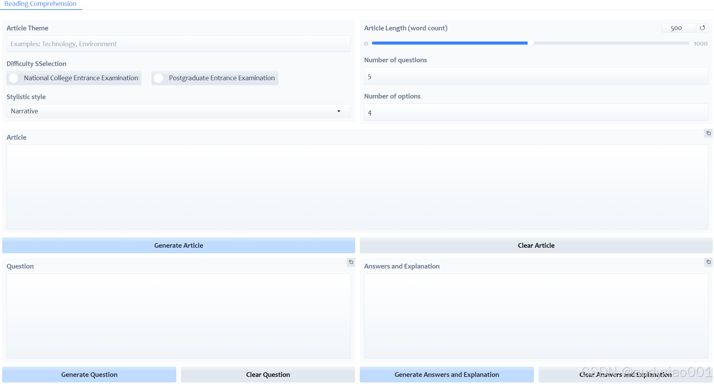 此外,为促进本框架的实际应用,该研究开发了一个基于Gradio的轻量级交互界面,如图3所示。该界面允许教育工作者无需任何编程背景,即可通过直观的下拉菜单和输入框,灵活设定阅读理解文章的主题、难度、长度、题目与选项数量等参数。用户点击生成按钮后,系统便能实时调用优化后的RCEG模型,自动产出包含文章、问题、答案及详细解析的完整练习材料。这一设计极大地提升了框架的易用性与实用性,使其能够无缝集成到真实的备课与学习流程中,真正体现了智能教育技术赋能教学实践的巨大潜力。