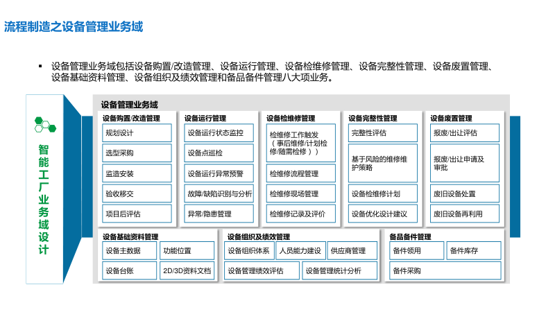 - 设备管理:涵盖设备购置/改造管理、设备运行管理、设备检维修管理、设备完整性管理等,保障生产设备的稳定运行。