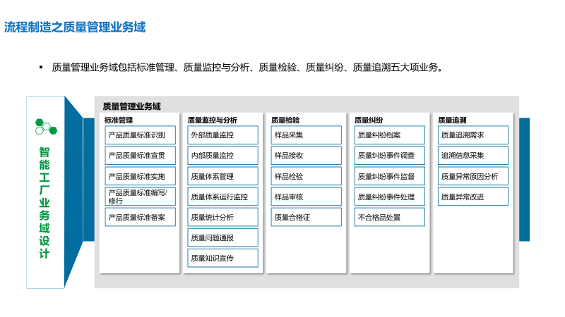- 质量管理:涵盖标准管理、质量监控与分析、质量检验、质量纠纷处理及质量追溯,确保产品质量符合标准。
