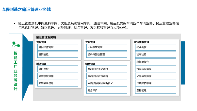 - 储运管理:包括管网管理、罐区管理、火炬管理、调合管理、发运接收管理等,实现物料的安全储存与高效运输。