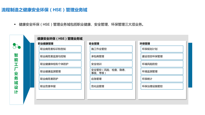 - 健康安全环保(HSE)管理:包括职业健康、安全管理、环保管理,确保生产活动的环境友好与人员安全。