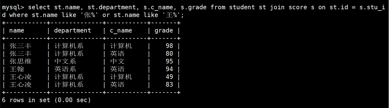 (14) 查询姓张或姓王的同学的姓名、院系、考试科目及成绩