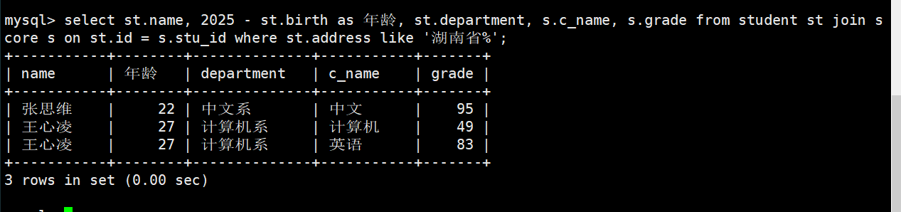 (15) 查询湖南学生的姓名、年龄、院系、考试科目及成绩
