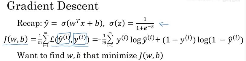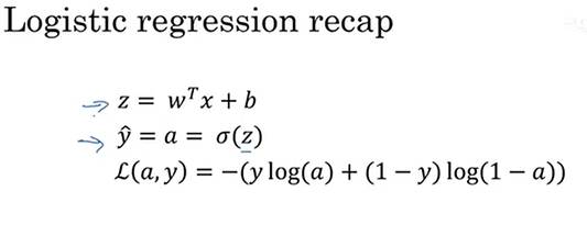 下面是熟悉的logistic回归算法,第二行是成本函数,定义为平均值。即1/m的损失函数之和。损失函数可以衡量算法的效果。每一个训练样例,都输出