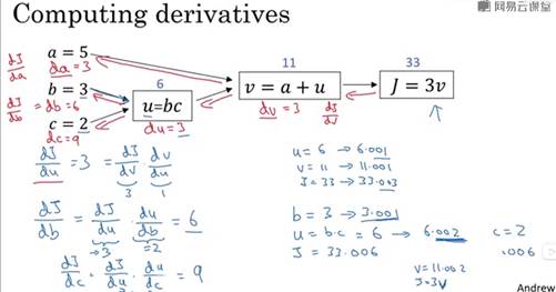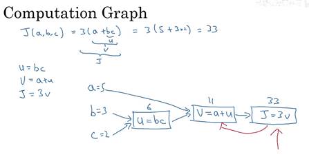 有三个步骤,计算u=bc,计算v=a+u,计算J=3v。可以画成如下流程图,举个例子,对a,b,c赋值为5,3,2,此时J=33。可以看到这样一个从左到右的流程可以计算出J。
