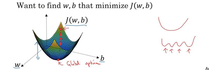 现在w在初始值位置(右侧最高点),对应成本函数J(w)在曲线上的一点,导数的定义是曲线在这一点的斜率,这里导数是正的,新的w值等于w减去学习率乘以导数,因此w接着向左走一步。算法使得w渐渐减小。反之,如果w在左侧最高点,此时导数是负的,w值等于w减去学习率乘以导数,w就会渐渐增大。无论w在哪里,梯度下降法会朝着全局最小值方向移动。
