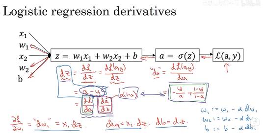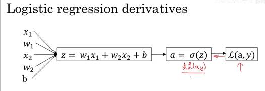 回顾一下logistic回归中的损失函数,现在只考虑单个样本,关于该样本的损失函数定义如下,a是logistic回归的输出,y是真值标签值(ground truth label),写在写出该样本的偏导数流程图,假设样本只有两个特征x1和x2,为了计算z,我们需要输入参数w1、w2和b。然后,计算。最后计算