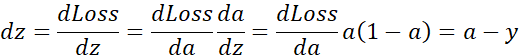 的导数,首先要向前一步,计算损失函数关于a的导数,在代码中,使用da来表示这个变量,现在进一步计算dz,损失函数关于dz的导数。最后一步,计算关于w1、w2和b的导数