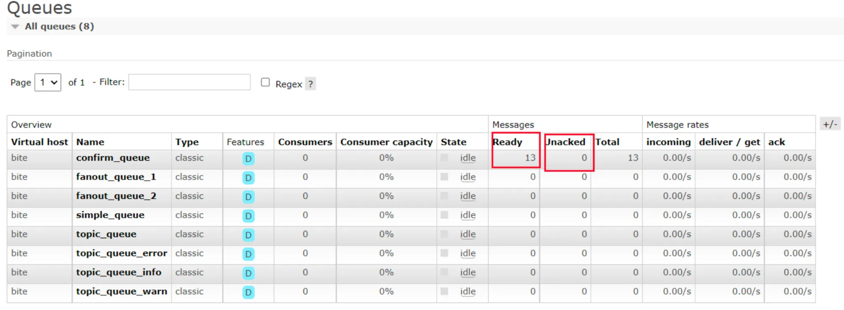 Unacked(投递到消费者时),但因异常被自动拒绝 + 重新入队,最终Unacked归零,Ready加 1。