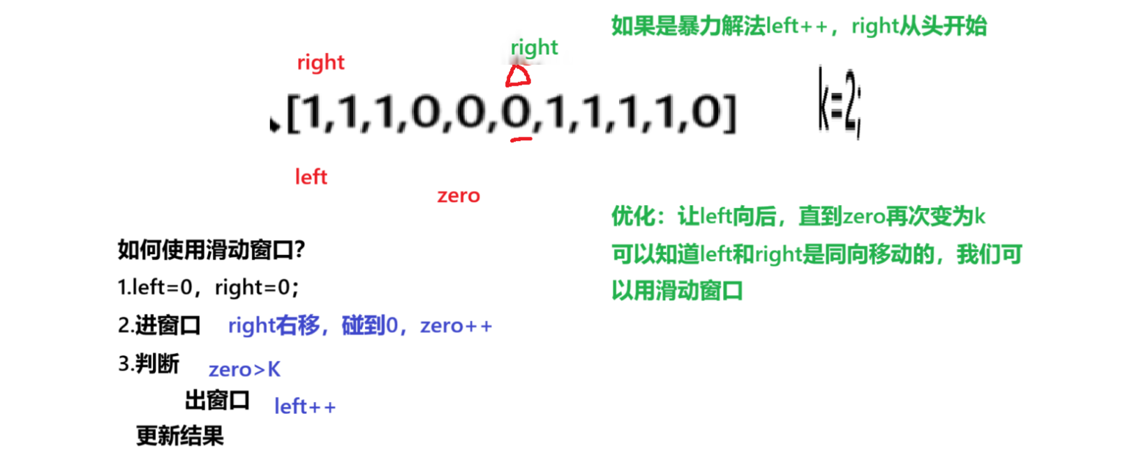 那么我们就可以大胆的把left1舍去,那么我们left右移,如果让right从头开始必然会有很多重复的计算,我们就可以让right先不动,如果不满足要求,那么right++,则可知left和right是同向移动的,不回退的,所以时间复杂度是O(N)