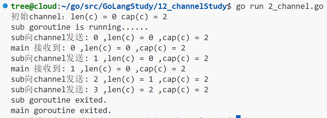 )func main() {// channel缓冲区满,写数据阻塞;channel缓冲区空,读数据阻塞// 1. 定义有缓冲 channelc := make(chan int, 2)fmt.Println("初始channel:len(c) =", len(c), "cap(c) =", cap(c))go func() {defer fmt.Println("sub goroutine exited.")fmt.Println("sub goroutine is running......")// 2. 向channel中写入for i := 0; i < 4; i++ {c <- ifmt.Println("sub向channel发送:", i, ",len(c) =", len(c), ",cap(c) =", cap(c))time.Sleep(50 * time.Millisecond)}}()// time.Sleep(1 * time.Second)for i := 0; i < 2; i++ {fmt.Println("main 接收到:", <-c, ",len(c) =", len(c), ",cap(c) =", cap(c))}time.Sleep(1 * time.Second)fmt.Println("main goroutine exited.")