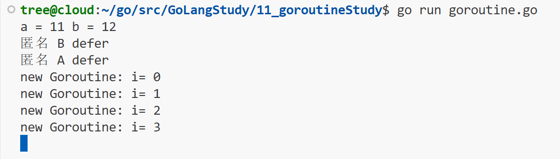 func main() {// 创建一个go程去执行newTask()调度go newTask()// 无参匿名函数go func() {defer fmt.Println("匿名 A defer")// 外层想退出,可以直接returnfunc() {defer fmt.Println("匿名 B defer")// 内部这层使用return只会退到外层,使用以下函数可实现退出runtime.Goexit()fmt.Println("-----B-----")time.Sleep(2 * time.Second)}() // 如果没有结尾的()相当于只定义了,未调用fmt.Println("-----A-----")time.Sleep(2 * time.Second)}()// 有参匿名函数go func(a int, b int) bool {fmt.Println("a =", a, "b =", b)return true // 从协程和主协程是一个异步的操作// 如果想要主go程得到从go程的值,需要借助管道机制}(11, 12)// 开启这部分的死循环,就不会退出了for {time.Sleep(1 * time.Second)}// fmt.Println("main Goroutine exit.\n")