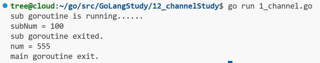 )func main() {// 无缓冲没有地方存放数据// 1. 定义无缓冲 channelc := make(chan int)go func() {defer fmt.Println("sub goroutine exited.")fmt.Println("sub goroutine is running......")// 2. 向channel中写入c <- 666c <- 555time.Sleep(1 * time.Second)subNum := <-cfmt.Println("subNum =", subNum)}()// 思考问题:// 1) main goroutine会不会比sub goroutine先执行导致无法接收到数据,无法打印出num?// 答:无缓冲channel的同步特性确保了数据传输的时序:发送者会等待接收者,接收者会等待数据。// 2) 管道中的数据读出来之后还会有吗?// 答:channel中的数据具有一次性消费特性,读取后即从channel中移除。// 读取次数和发送次数不等会导致goroutine永久阻塞,产生deadlock// 3. 从channel中读数据// <-和c之间不能有空格<-c // 读取并丢弃num := <-c // 读取并赋值c <- 100fmt.Println("num =", num)fmt.Println("main goroutine exit.")}