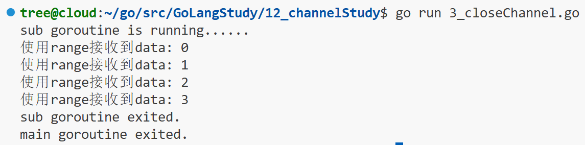 package mainimport "fmt"func main() {// 定义一个channelc := make(chan int)go func() {defer fmt.Println("sub goroutine exited.")fmt.Println("sub goroutine is running......")for i := 0; i < 4; i++ {c <- i}// 关闭channelclose(c)// 如果没有close(c),会发生死锁,可以注释掉尝试一下// 如果向已关闭的channel发送数据会发生以下错误// panic: send on closed channel// c <- 99}()// for {// // 这种写法将作用域限制在if中// // 条件是ok为true// if data, ok := <-c; ok {// fmt.Println("接收到data:", data)// } else {// break// }// }// 以上代码可以优化为以下的写法for data := range c {fmt.Println("使用range接收到data:", data)}defer fmt.Println("main goroutine exited.")