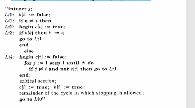 c[i] := false; // 否则(轮到自己),暂时取消准备状态for j := 1 step 1 until N do // 检查所有进程 j(1..N)if j # i and not c[j] then go to Lil; // 如果 j 不是自己且未准备好,回到 Lil 重新检查