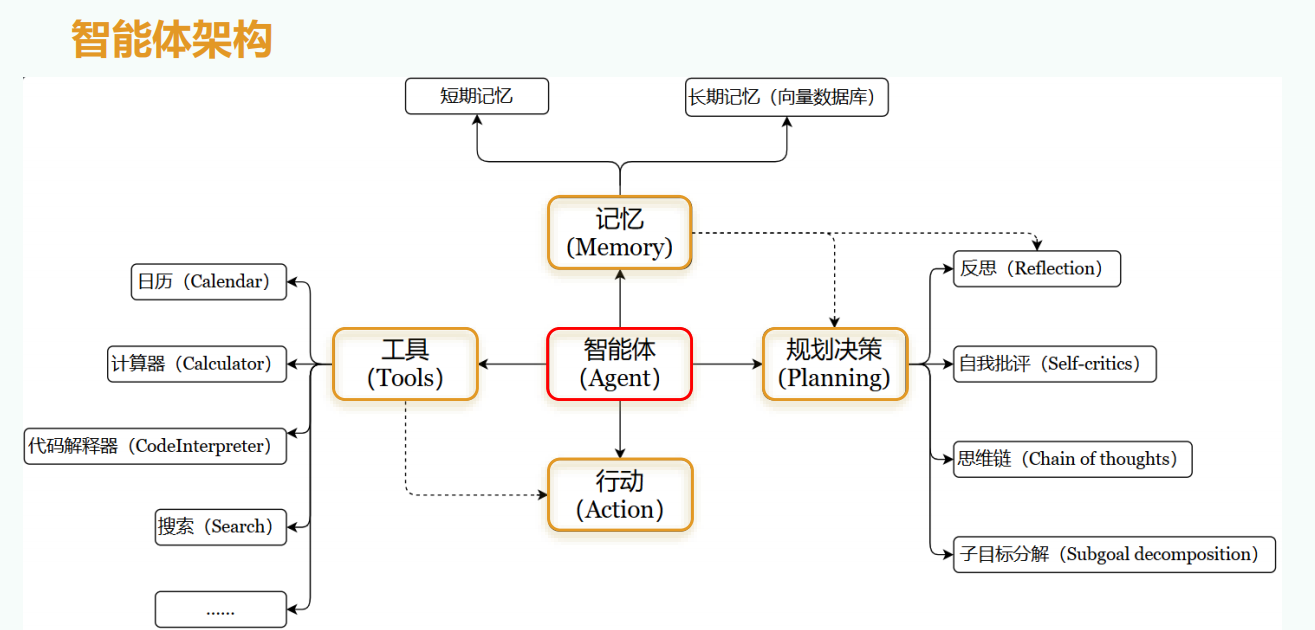 行动:实际执行决策的模块,涵盖软件接口操作(如自动订票)和物理交互(如机器人执行搬运)。比如:检索、推理、编程等。