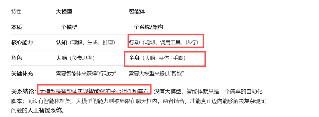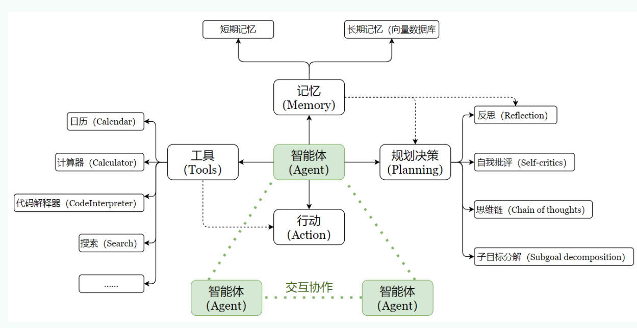 智能体 = 大模型 + 规划能力 + 工具使用 + 记忆机制。