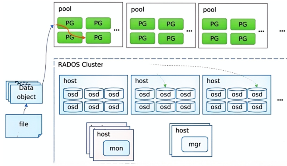 Pool、PG 和 OSD 的关系: 一个Pool里有很多个PG;一个PG里包含一堆对象,一个对象只能属于一个PG;PG有主从之分,一个PG分布在不同的OSD上(针对多副本类型)