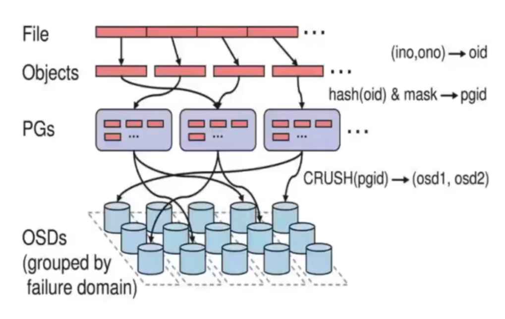 比如:一个文件 FileID 为 A,它被切成了两个对象,一个对象编号0,另一个编号1,那么这两个文件的 oid 则为 A0 与 A1。