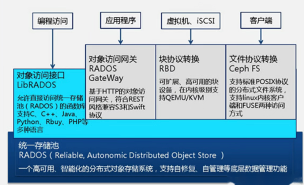 Librados提供了与RADOS进行交互的方式,并向上层应用提供Ceph服务的API接口,因此上层的RBD、RGW和CephFS都是通过Librados访问的,目前提供PHP、Ruby、Java、Python、Go、C和C++支持,以便直接基于RADOS(而不是整个Ceph)进行客户端应用开发。