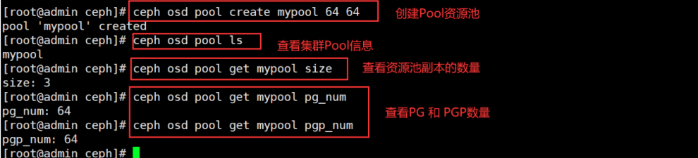 #创建一个 Pool 资源池,其名字为 mypool,PGs 数量设置为 64,设置 PGs 的同时还需要设置 PGP(通常PGs和PGP的值是相同的):