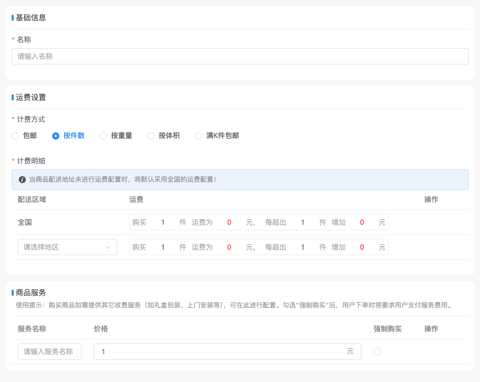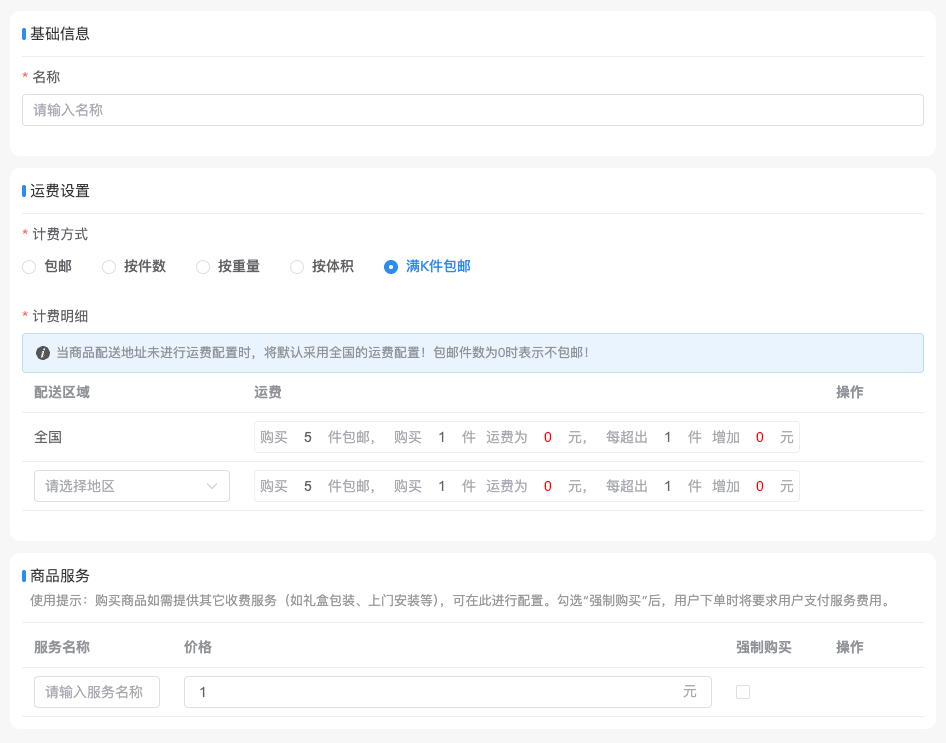 因此,目前主流的“物流设置”或“运费设置”,应该调整为“运费及服务设置”!而运费及服务的设置UI大致如下: