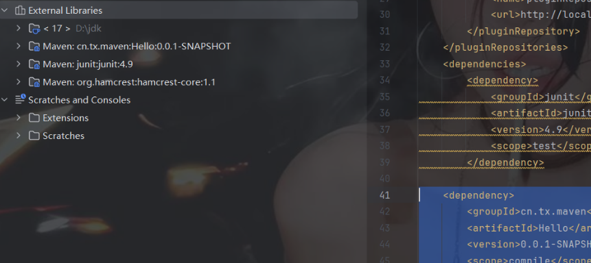 Maven的解决方案:你只需要在一个配置文件(pom.xml)里声明需要什么“零件”(比如:“我需要一个版本为 5.1.47 的 MySQL 驱动包”),Maven 就会自动从中央仓库(可以理解为一个巨大的网上图书馆)帮你下载,并且会把它依赖的其他“零件”也一并下载好。