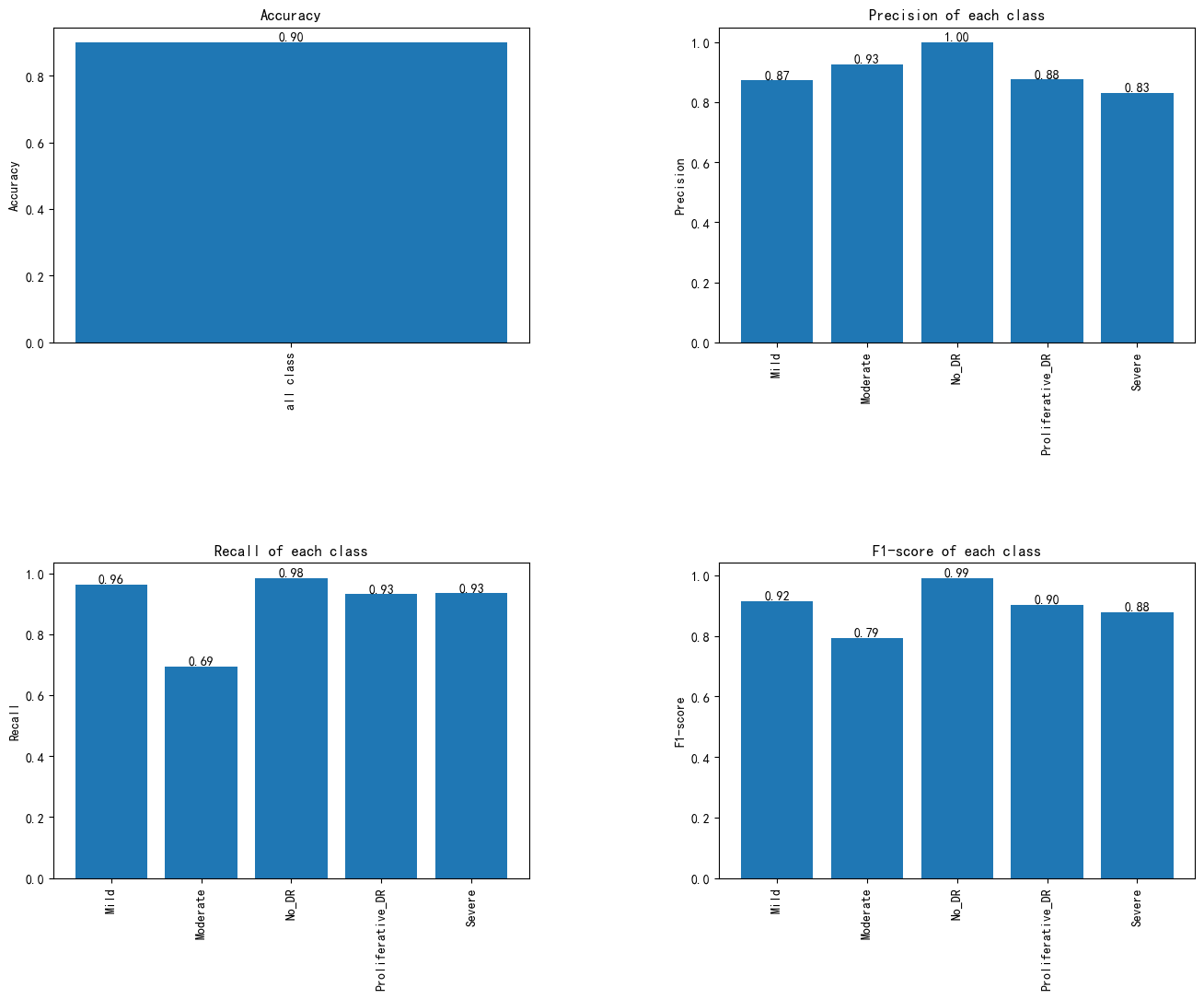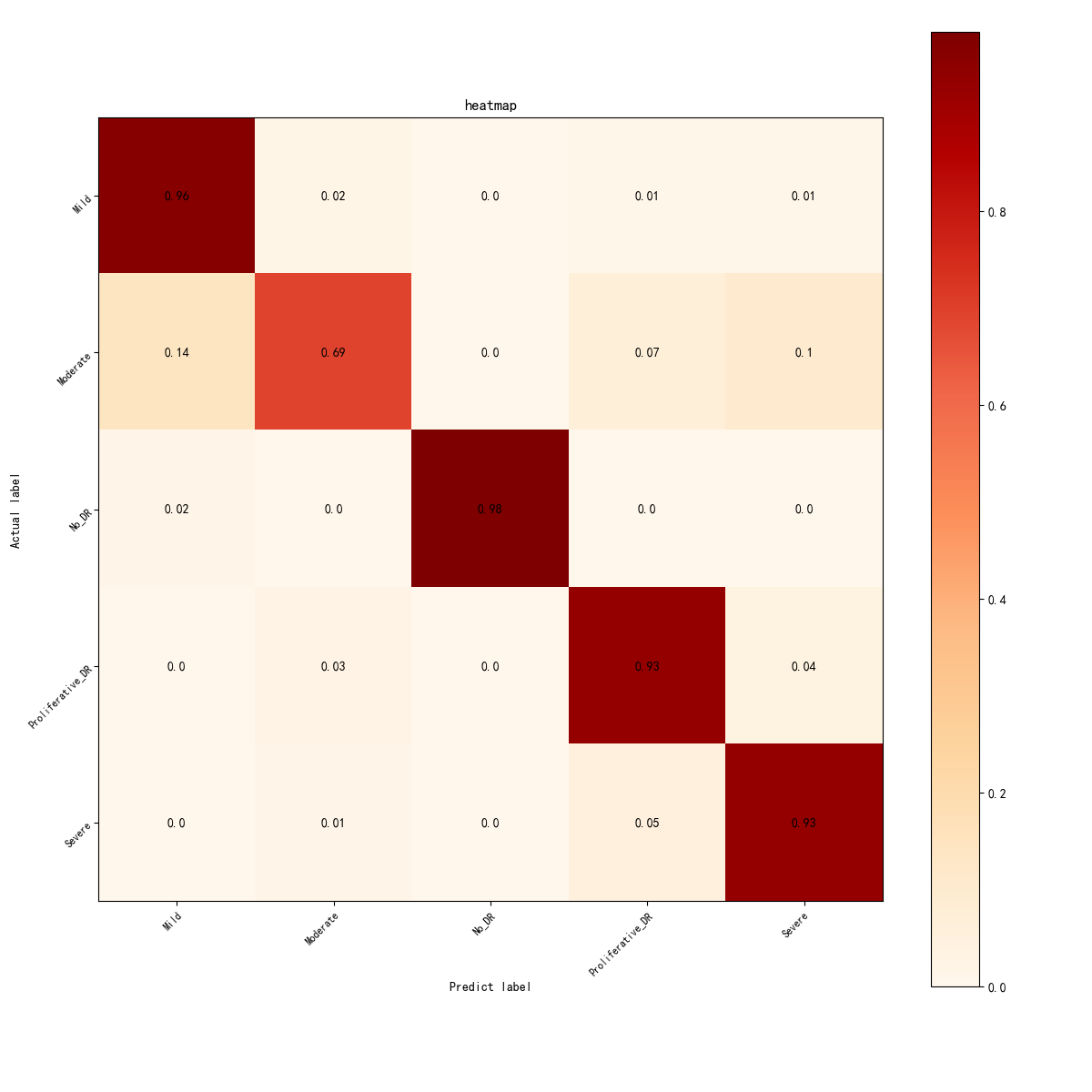混淆矩阵展示了不同类别的预测结果,其中轻度病变的准确率较高(0.96),中度病变的召回率较低(0.69),这表明模型在处理轻度病变时表现较好,但在中度病变的分类上存在一定挑战。其他类别,如无病变、增殖性病变和重度病变,表现较为均衡,分类精度较高。这表明模型在糖尿病视网膜病变的诊断中能较好地区分不同的病变类别。