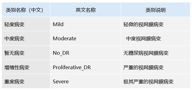 (2)数据结构:包含训练集与测试集,分为五类样本(轻度病变、中度病变、增殖性病变、重度病变、无病变)。