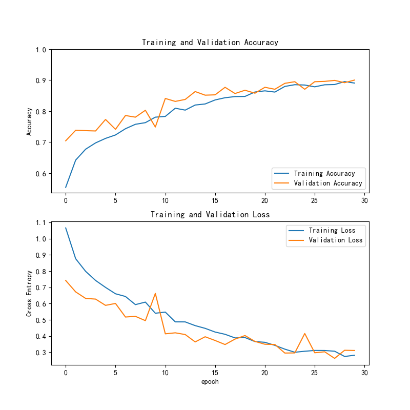 该图展示了模型在训练和验证过程中的准确率和损失变化。训练准确率稳步上升,接近 90%,而验证准确率也随之提高,显示出模型在不同数据集上的良好适应性。训练损失和验证损失均呈下降趋势,表明模型在训练过程中有效地减少了误差,并且未发生明显的过拟合现象。这表明模型具有较强的泛化能力,能够在未见数据上保持较好的表现。