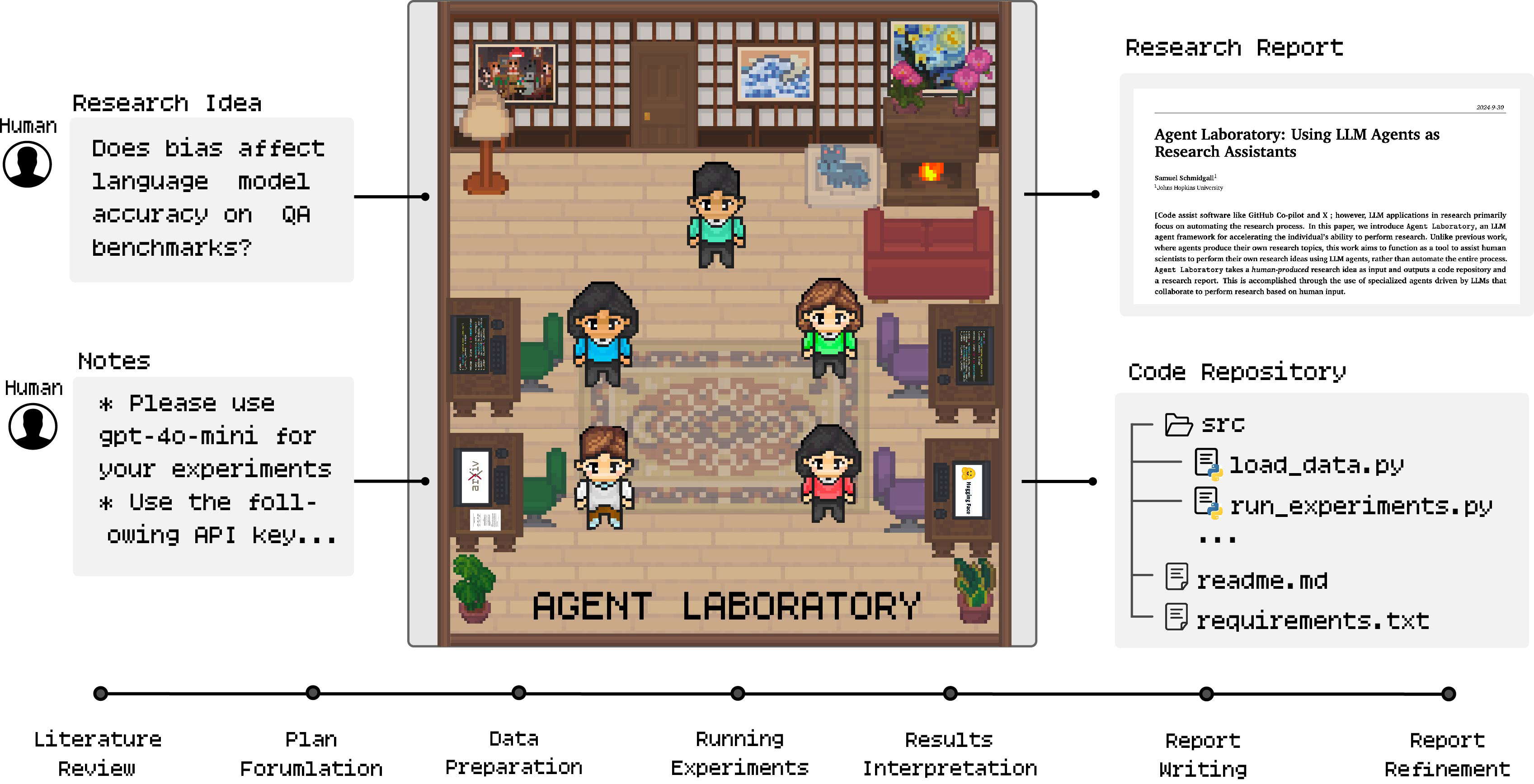 Agent Laboratory begins with the independent collection and analysis of relevant