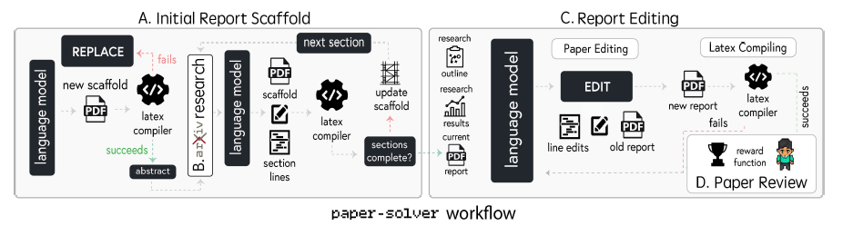 Fig.4 The workflow starts with the creation of an initial report scaffold (A) by iteratively generating LaTeX-based sections, followed by updates to ensure structural completeness. (B) Research is performed through an Arxiv tool during relevant sections. In the Report Editing phase (C), the language model applies targeted edits to improve the document, with LaTeX compilation verifying the integrity of changes. Finally, the completed report undergoes a reward-based evaluation during the Paper Review phase (D), ensuring alignment with academic standards and research goals.