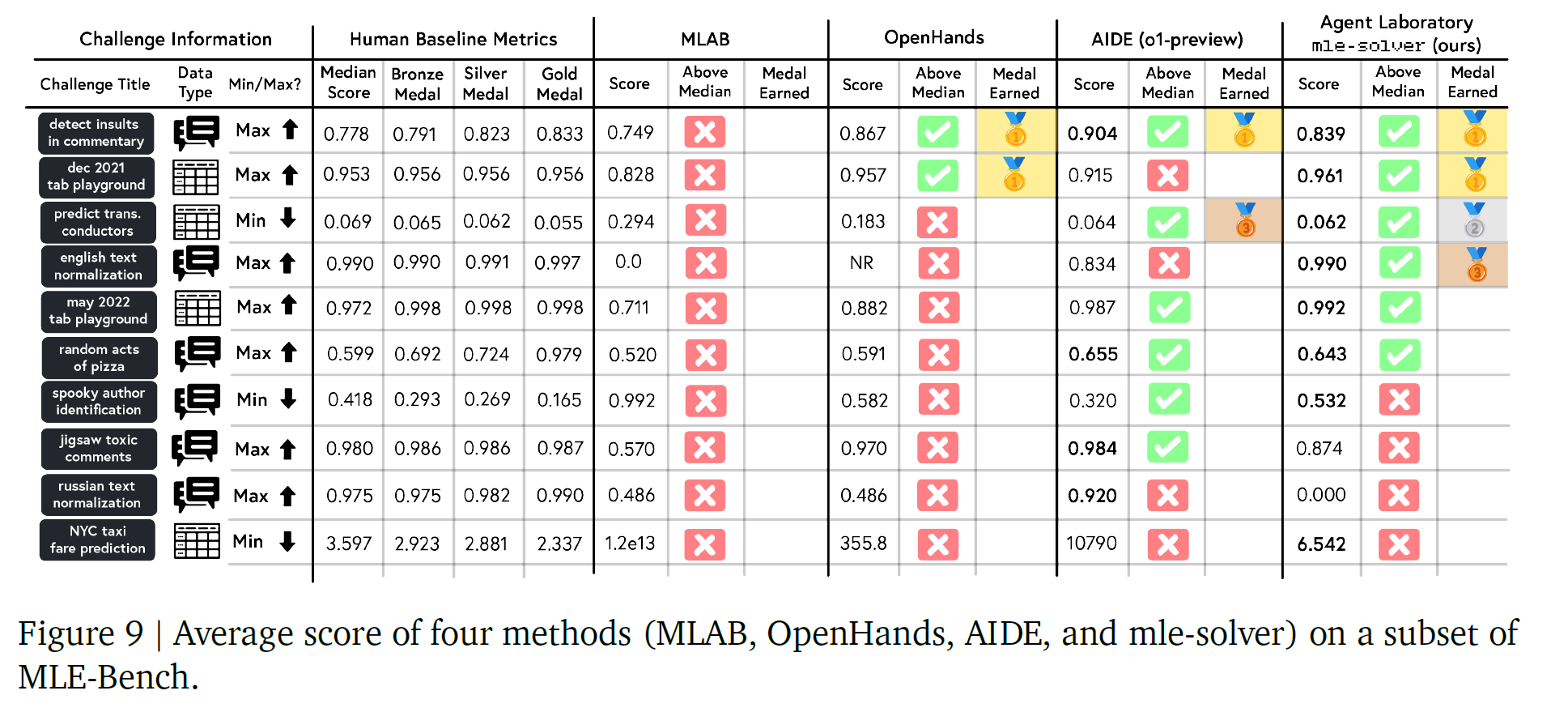 在 MLE-Bench 挑战集上的表现显示,Agent Laboratory 提出的 mle-solver 模块取得了最先进的性能表现,在稳定性与得分一致性方面优于其他求解器,并获得了比 MLAB、OpenHands 和 AIDE 更多的奖牌(包括金牌和银牌)。