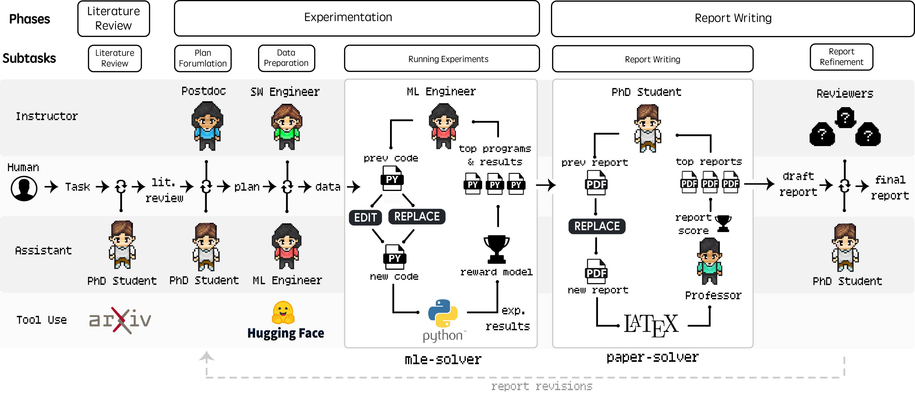 In the report writing phase, the PhD and Professor agent synthesize the research findings into a comprehensive academic report. This process is facilitated by a specialized module paper-solver, which iteratively generates and refines the report.