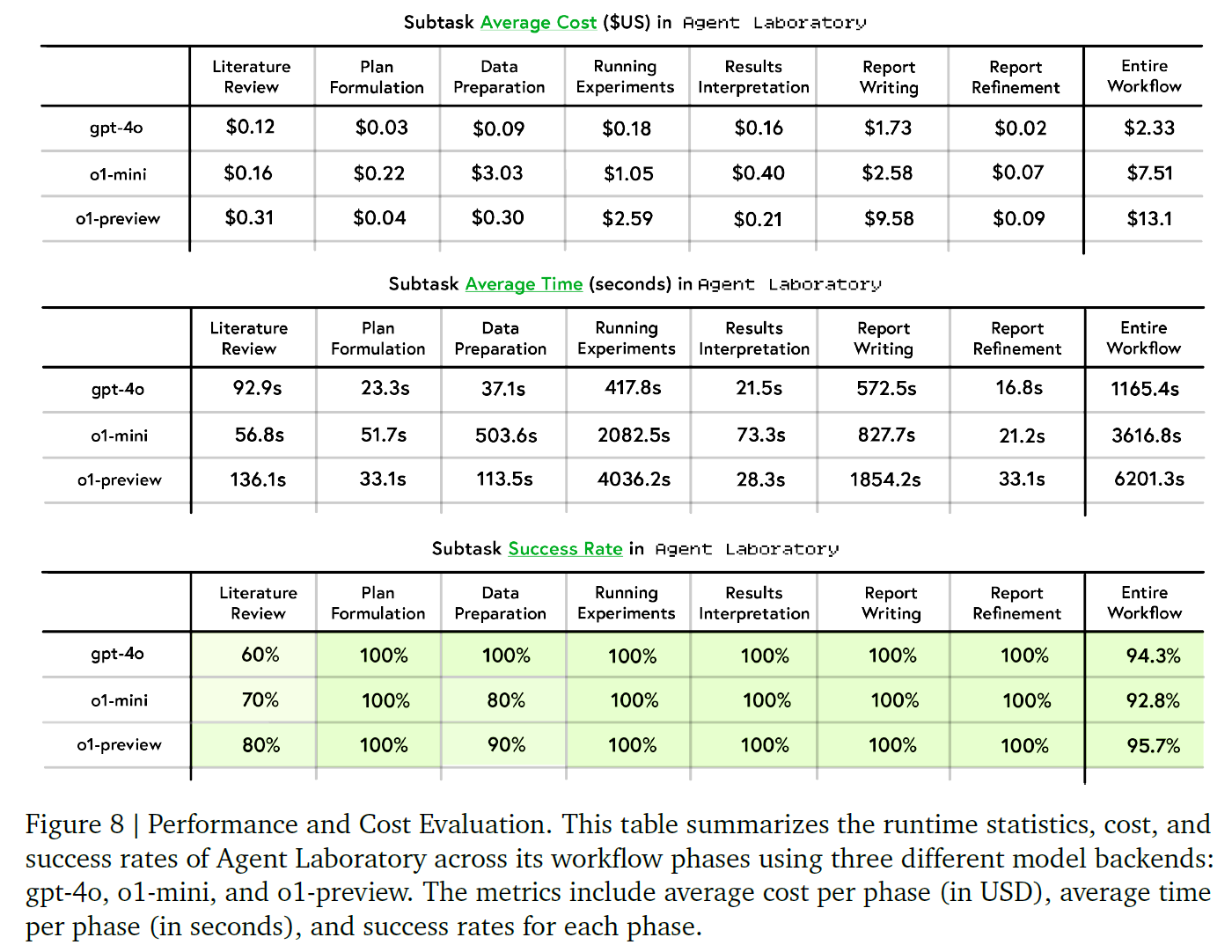 详细的成本与推理时间统计表明,Agent Laboratory 在不同模型后端下的论文生成成本极低。例如,使用 gpt-4o 后端时,每篇论文的平均成本仅为 2.33 美元,远低于其他自动化科研系统,证明其在成本效率上的显著优势。