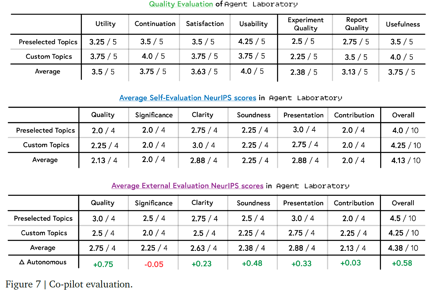 Co-pilot模式评估结果显示,在自定义与预设主题上,该模式整体得分高于全自动模式。Co-pilot 模式生成的论文在实验质量与实用性上表现出更高的平衡性,但也揭示了智能体输出与研究者意图之间的对齐挑战(确实,我觉得肯定要有人提供反馈的)。
