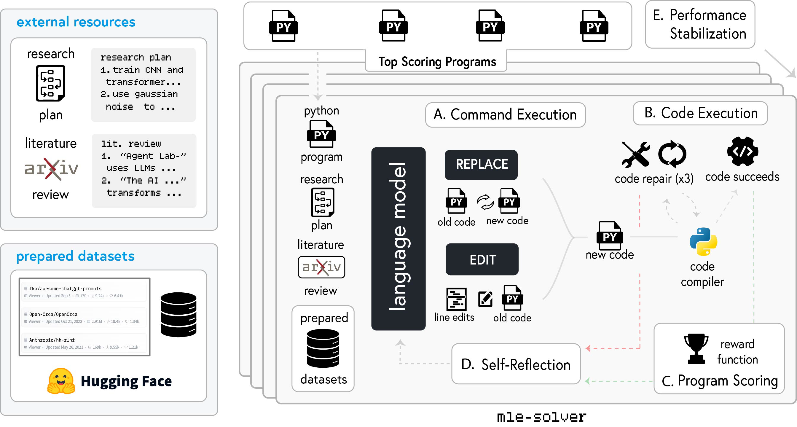 This is facilitated by mle-solver, a specialized module designed to generate, test, and refine machine learning code autonomously based on the research plan and insights from the
